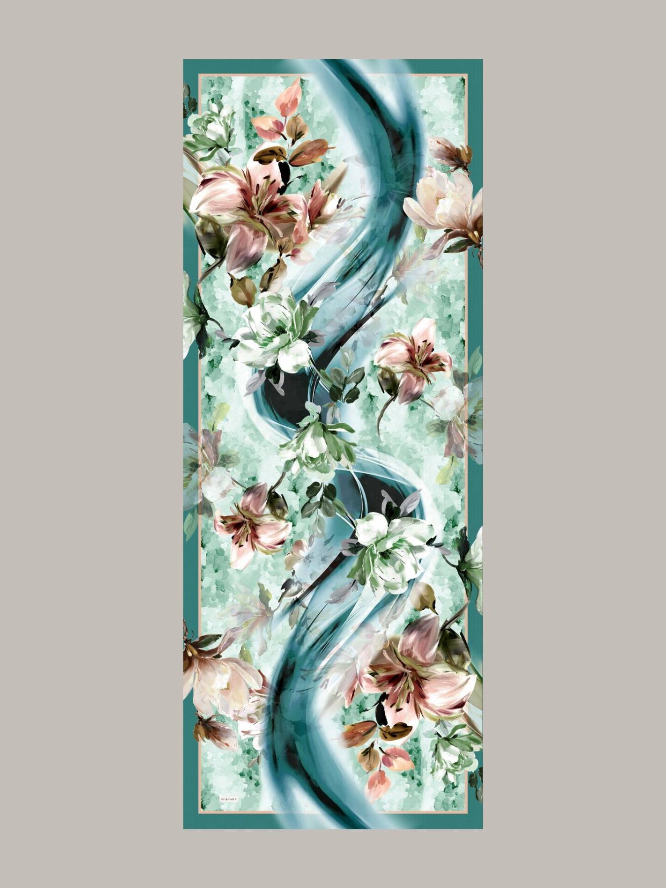 Arşiv meşklerinde tekrar edilen kavis hareketini büyütüp su lekeleriyle katmanladık; kavislerin tepe noktalarına çiçek kümeleri yerleştirdik. Böylece göz, çizgiyi izlerken çiçeklerde durup nefes alıyor; sıcak–soğuk ve açık–koyukarşıtlıkları ritmi yönetiyor. Bordür, bu akışa zarif bir “pervaz” ekliyor. Her renk, bir şehir ânına bağlandı: kıyı, iskele, akşamüstü, pazar sabahı.