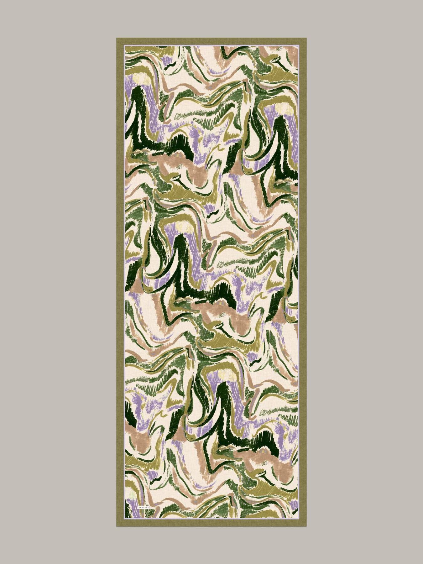 Ebru kültüründeki akış disipliniyle atölye fırçasının özgür jestini birleştirdik. Desende yükselen–alçalan ritim (usûl)okunuyor; kıvrımlar çağdaş, bordür ise arşiv cildi gibi kompozisyonu topluyor..