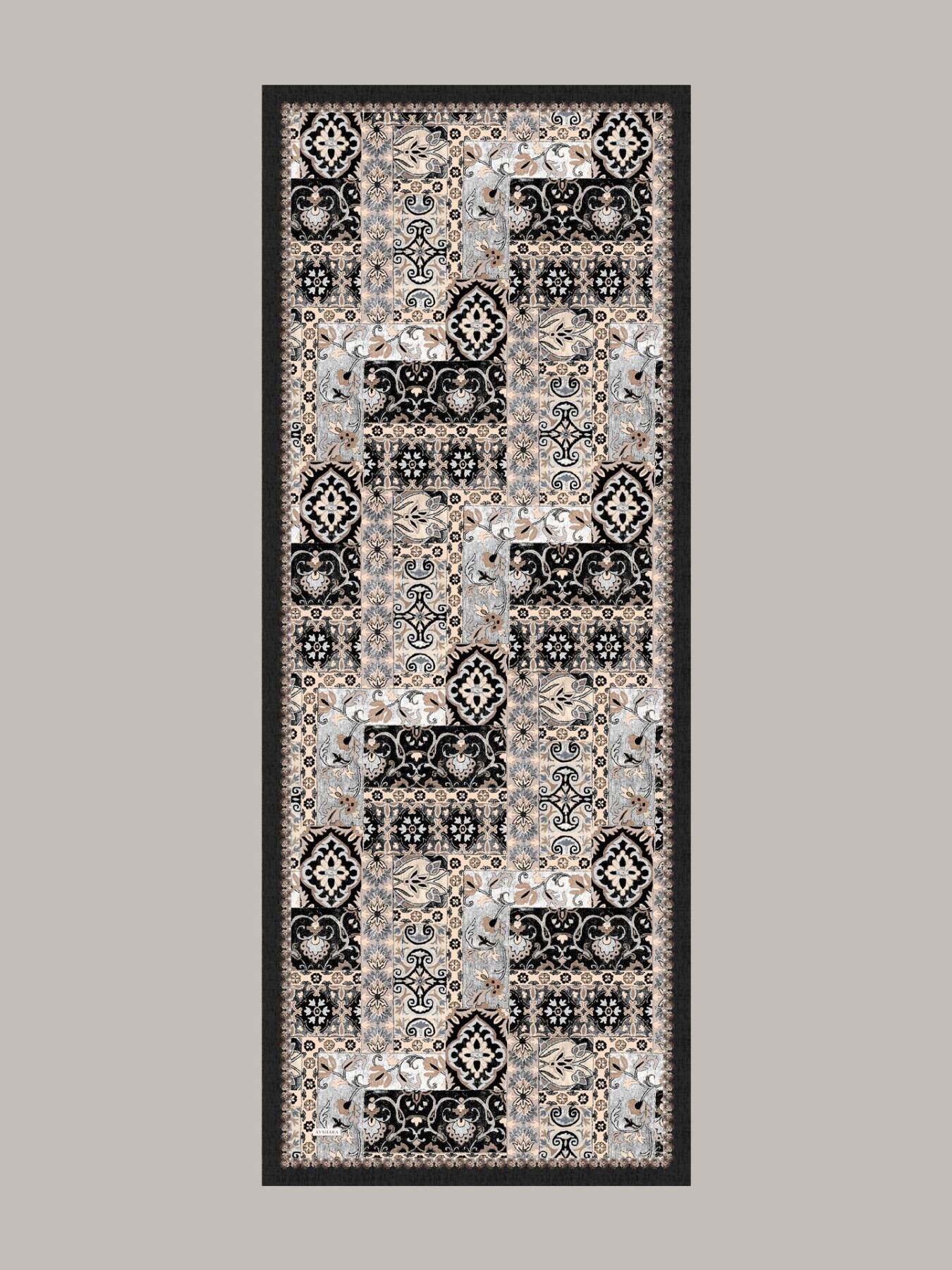 Kervansaray avlularındaki çini panolar, sandıklardan çıkan dantelimsi desenler ve kilim rıkaları… Hepsini küçük panellere böldük; bordür, eski bir albümün cildi gibi hepsini bir arada tutuyor.