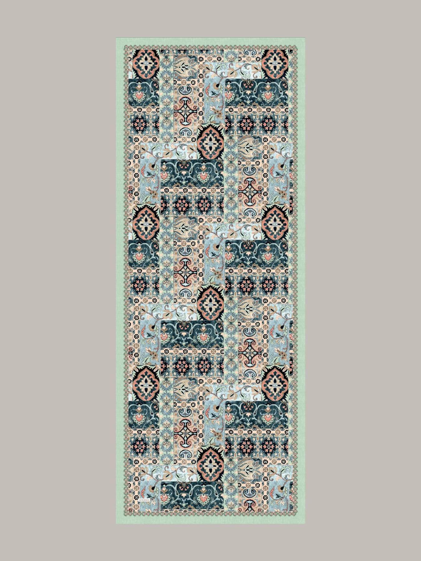 Kervansaray avlularındaki çini panolar, sandıklardan çıkan dantelimsi desenler ve kilim rıkaları… Hepsini küçük panellere böldük; bordür, eski bir albümün cildi gibi hepsini bir arada tutuyor.