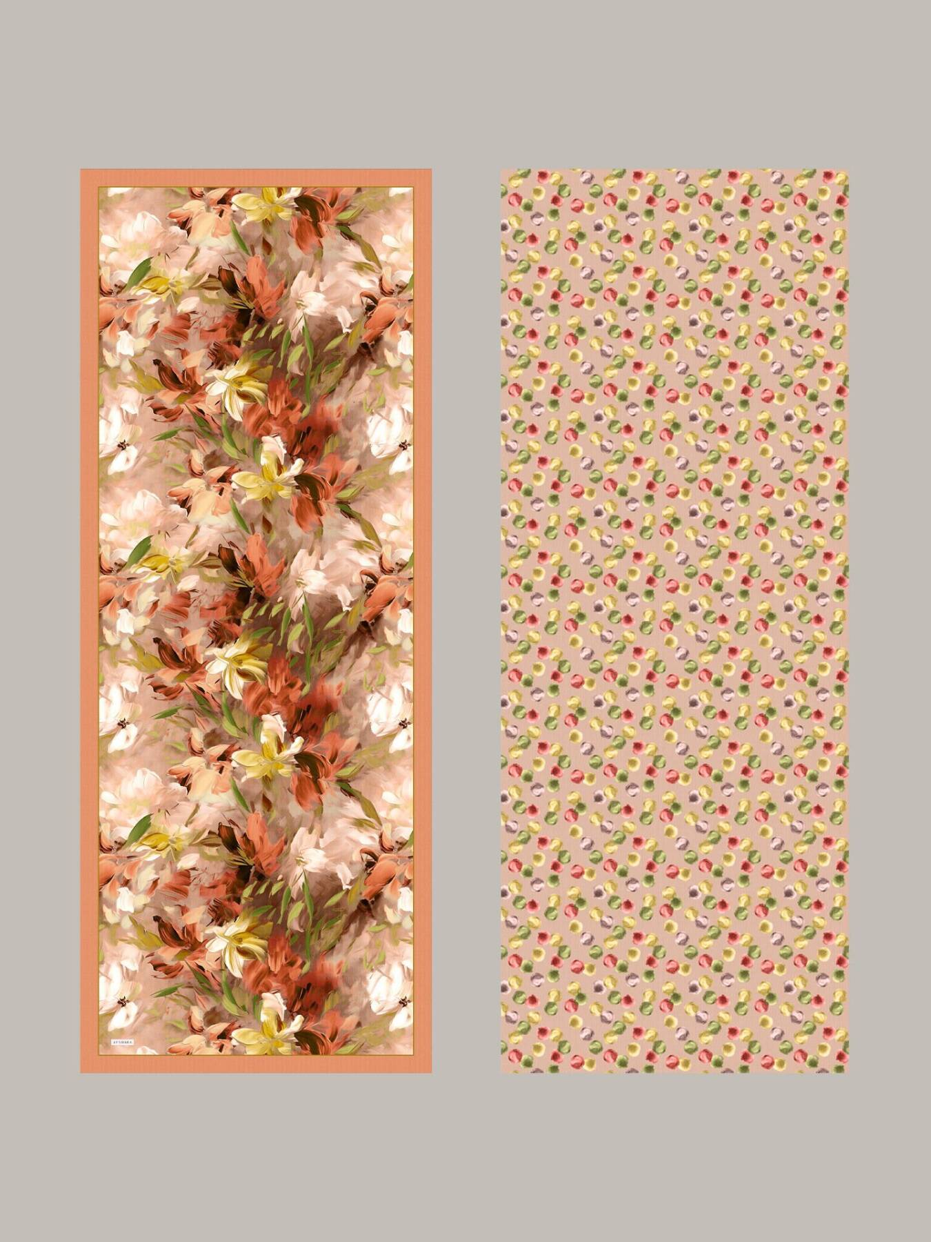 Arşiv çiçek ressamlığını ebruya benzeyen yumuşak renk buharlarıyla birleştirdik. Dikey akış hareket hissi verirken, ince bordür eski bir cildin omurgası gibi kompozisyonu toplar.