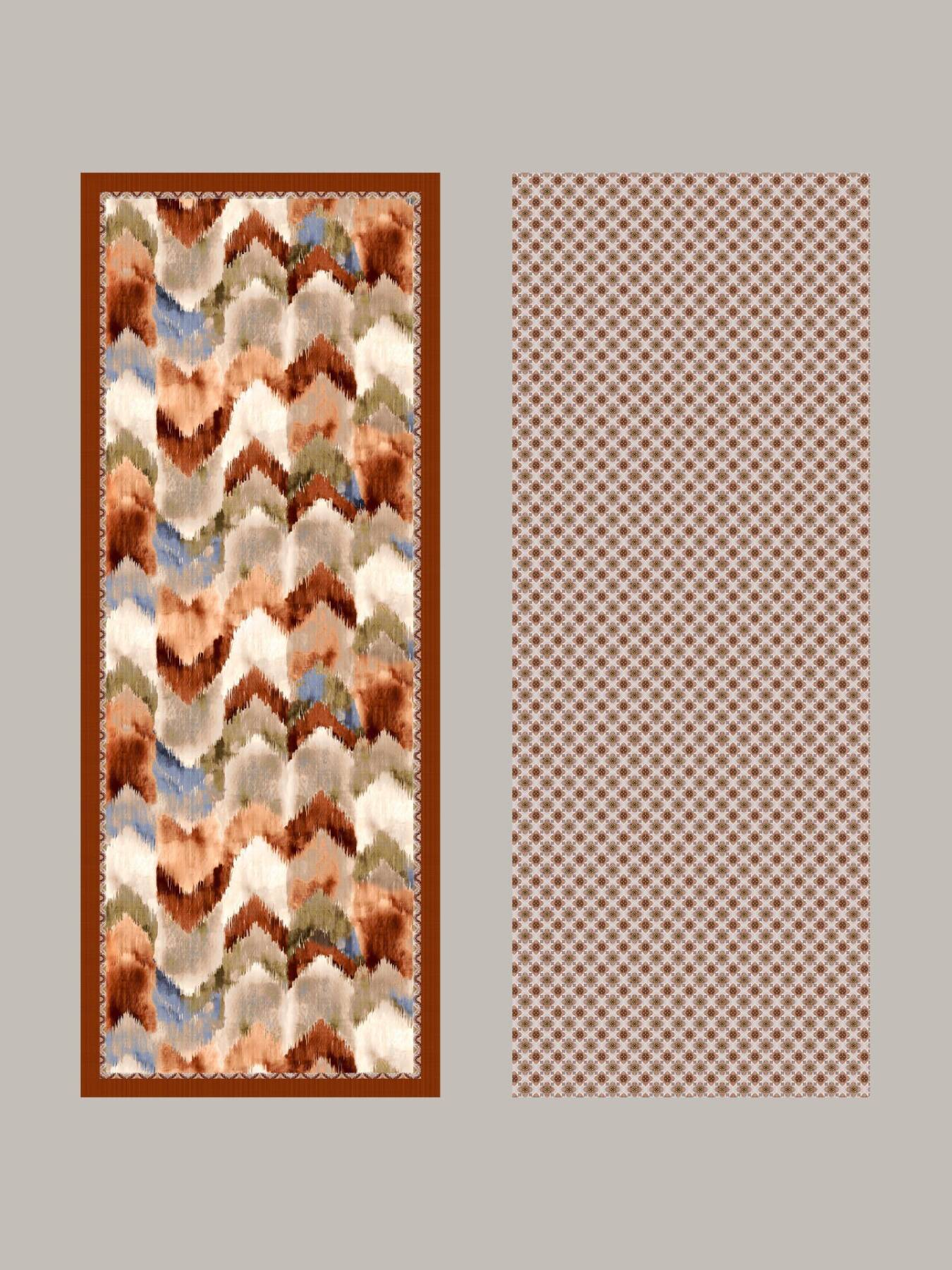 Arşivdeki kilim motif notlarıyla meşk defterlerindeki akış hareketini birleştirdik. Bulanık kenarlı zikzaklar, suyun kıyıda kırılarak ilerleyişini andırıyor; bordür, bu akışı zarif bir pervazla çerçeveliyor. Her palet bir şehir ânına bağlandı: kıyı esintisi, tuğla ısısı, bahçe gölgesi, akşam nabzı…